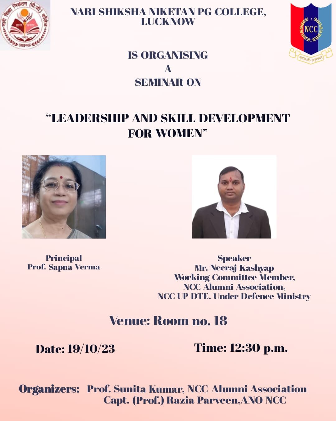 Seminar featuring Shri Neeraj Kashyap and Prof. Sunita Kumar on women's empowerment through skills.